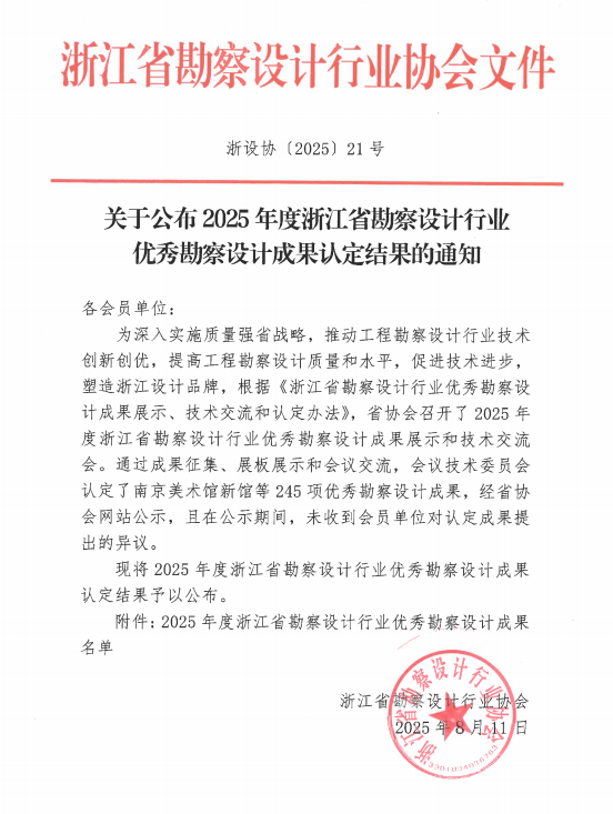 近日,2025年度浙江省勘察設計行業優秀勘察設計成果評選結果正式公布。由我院牽頭設計的“奉化江堤防整治工程鄞奉交界段”項目,繼榮獲寧波市優秀勘察設計獎之... -