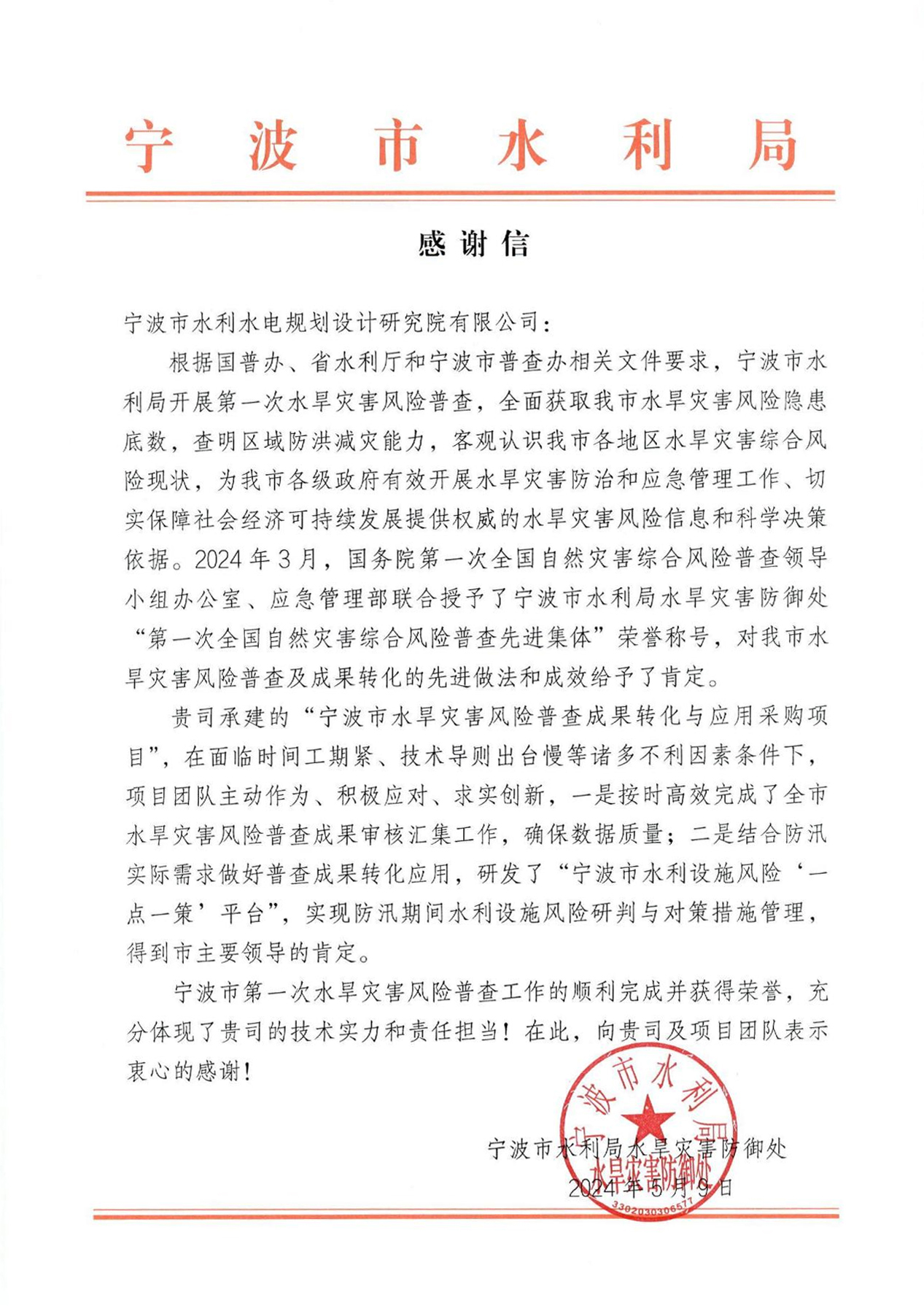 為寧波市水利院點贊——一封來自寧波市水利局水旱災害防御處的感謝信發布日期:2024.05.15