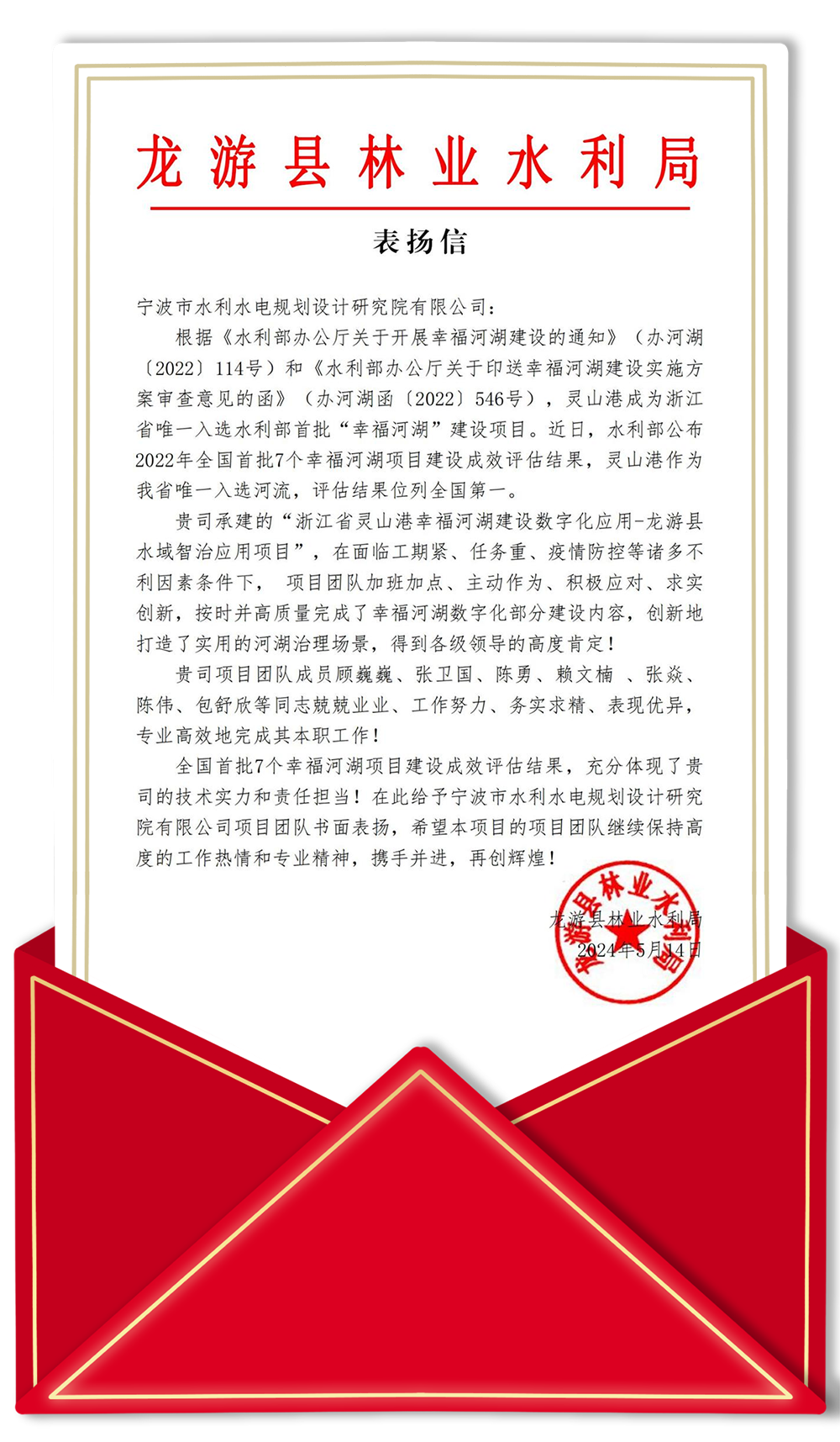 ? ? ? ?近日,我院收到一封來自業主單位衢州市龍游縣林業水利局的表揚信。信中提到:我院在承建“浙江省靈山港幸福河湖建設數字化應用-龍游縣水域智治應用項目”的過... -