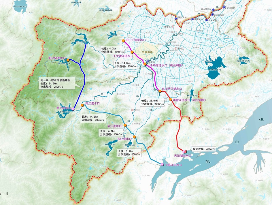 甬江流域南排通道工程項目建議書:該工程為《甬江流域防洪治澇規劃(2021-2035 年)》確定的甬江流域最大的分洪工程,工程擬設置東、西兩條分洪線路,總長約96.6公里,總規模1000立方米每秒。工程實施后,與規劃內工程聯合運用,將有效提升流域和區域防洪排澇能力。