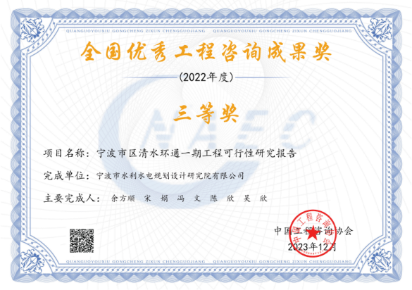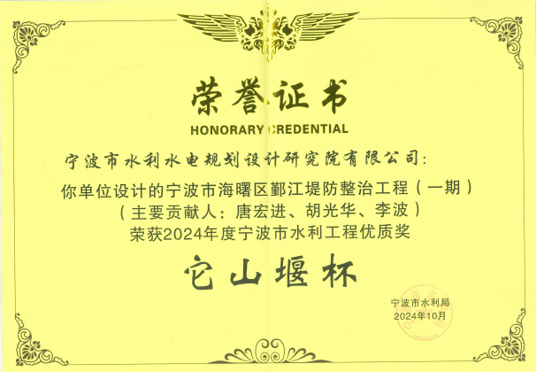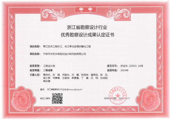 在工程項目方面,獲得2022年度全國優秀工程咨詢成果獎、2024年度寧波市優秀勘察設計獎、2024年浙江省勘察設計行業優秀勘察設計”綜合類成果獎、寧波市優秀水利工程設計二等獎、“浙江省文明標化工地”稱號、“2024年度寧波軌道交通市域鐵路工程立功競賽先進集體”等各類獎項十余項。