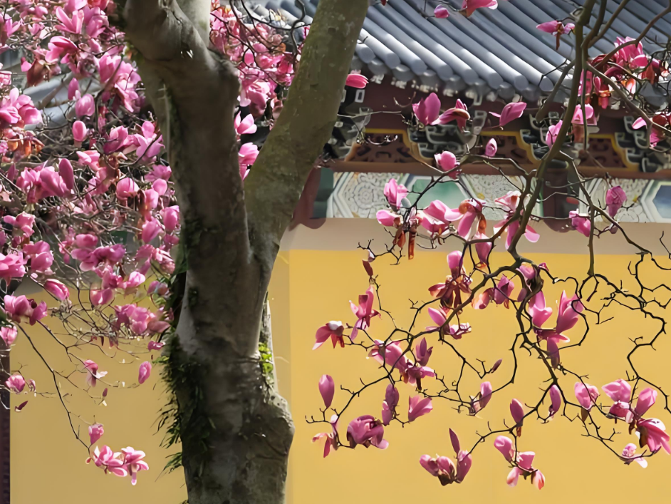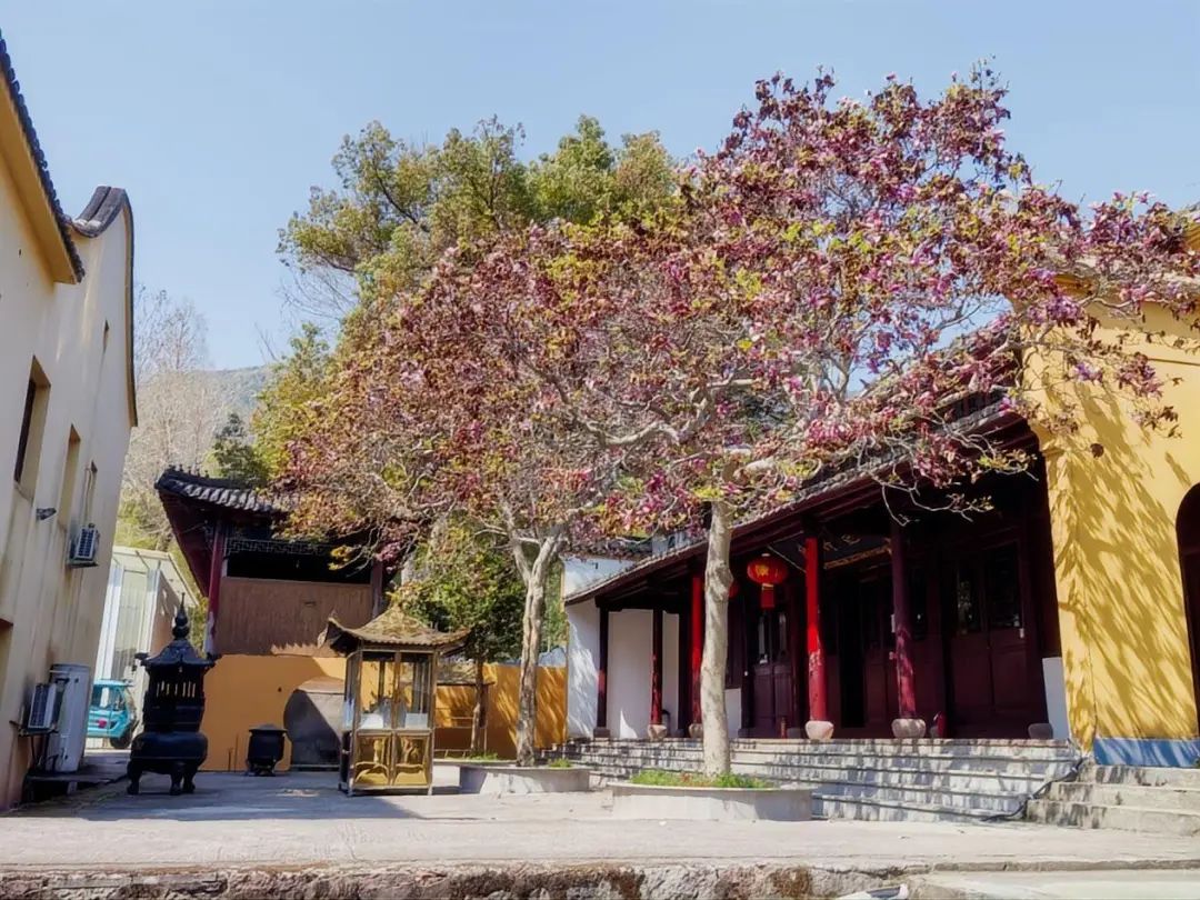 早上8:45,大巴準時從園區啟程,在陽光明媚中駛向寧波象山墻頭鎮舫前村。抵達智門禪寺時,茶園環繞,竹海綿延,百年紫玉蘭正值花期。大家或駐足欣賞古剎花影,或在禪寺咖啡館品鑒特色飲品,于傳統與現代交融中開啟這一天的芳菲之旅。