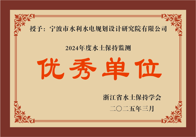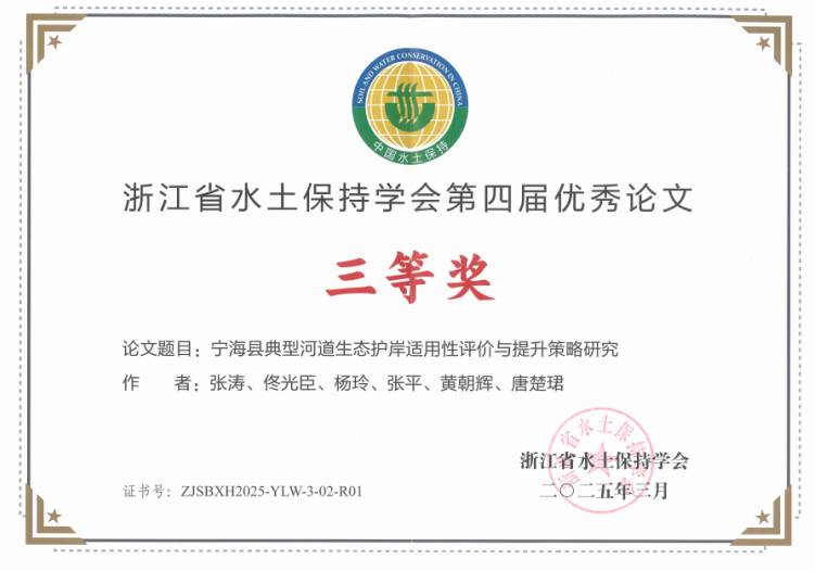 會議現場通報了2024年度生產建設項目水土保持方案優秀單位、2024年度生產建設項目水土保持監測優秀單位,并為獲獎集體進行表彰。隨后,又現場表彰了浙江省水土保持學會第四屆優秀論文評選結果。我院榮獲2024年度生產建設項目水土保持方案優秀單位、2024年度生產建設項目水土保持監測優秀單位兩項集體榮譽,并且以論文《寧海縣典型河道生態護岸適用性評價與提升策略研究》獲得浙江省水土保持學會第四屆優秀論文三等獎。