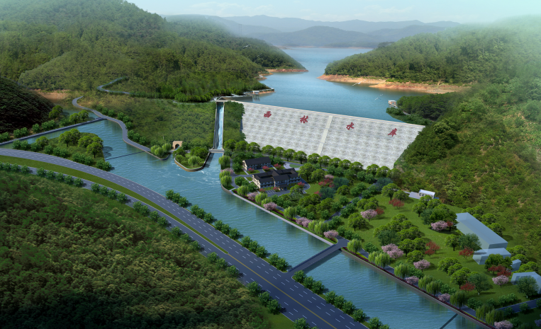 水庫樞紐工程主要由攔河壩、溢洪道、放空洞(導流洞改建)、引水發電洞、發電廠和升壓站、河道、道路及管理區等建筑物組成。水庫正常蓄水位65.00m,設計洪水位68.62m,校核洪水位70.71m,總庫容1365萬m3。大壩為砼面板堆石壩,壩頂高程為71.40m,防浪墻頂高程72.60m,最大壩高46.4m,壩頂寬度7.0m,長度306.4m。