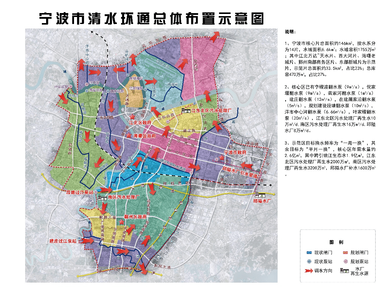 本工程任務為通過生態引調水,讓平原河網的水體活起來、動起來,改善河道水環境。工程位于寧波市區,主要包括引排水泵站及凈化工程、中環通分區調控工程(結合排澇節制閘)、小環通及微循環分區調控工程(調水節制閘)、水系連通工程及其他工程等五部分。