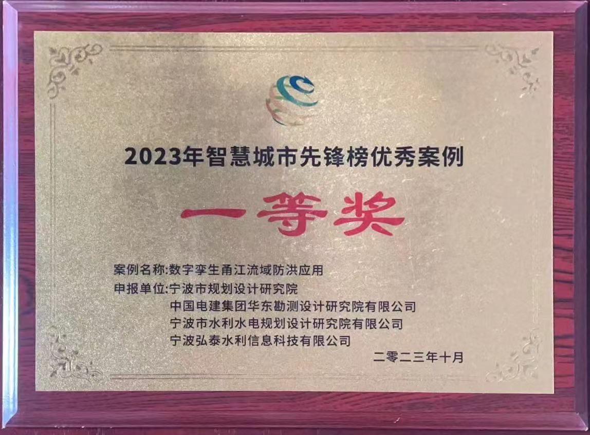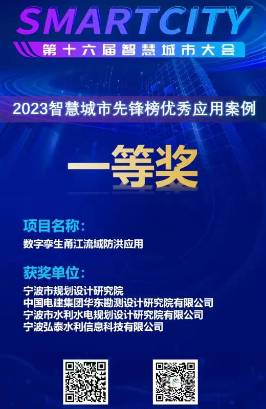 近日,我院與寧波市規劃設計研究院、華東勘測設計研究院有限公司、寧波弘泰水利信息科技有限公司共同承擔的“數字孿生甬江流域防洪應用”項目作為寧波智慧城市創新應用成果,精彩亮相“第十六屆中國智慧城市大會”,并榮獲2023智慧城市先鋒榜優秀應用案例一等獎,同時入選《中國智慧城市優秀應用案例集(2023)》,已由中國電力出版社出版發行。