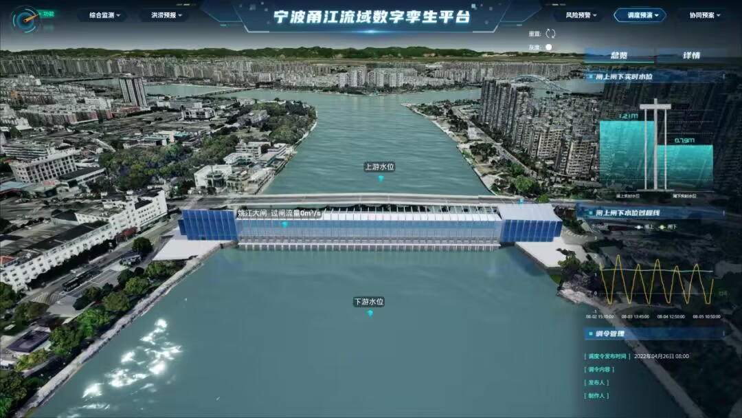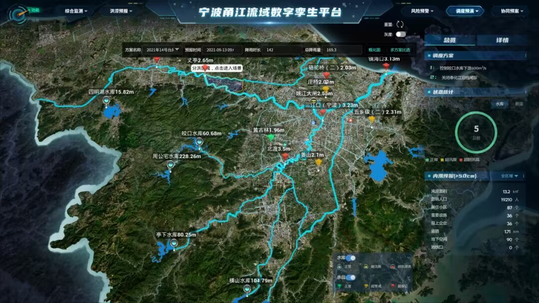 目前,基于寧波甬江流域數字孿生平臺打造的防洪應用已完成“綜合監測、洪澇預報、風險預警、仿真預演、協同預案”5大功能板塊的開發和“三江堤防、沿海海塘、重點水庫、重要設施內澇”4個“四預”場景的應用。