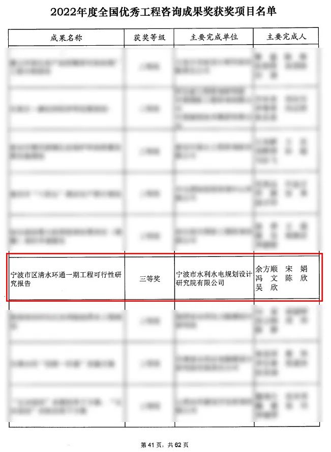 近日,中國工程咨詢協會公布2022年度全國優(yōu)秀工程咨詢成果獎獲獎項目名單,寧波市水利院申報的《寧波市區(qū)清水環(huán)通一期工程可行性研究報告》咨詢成果順利通過公示,榮獲2022年度全國優(yōu)秀工程咨詢成果三等獎!該獎項由中國咨詢工程協會組織申報評審,每兩年評選一次,是中國工程咨詢行業(yè)含金量最高的獎項。