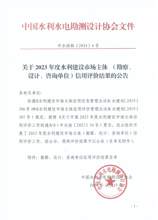 近日,中國水利工程協會《關于2023年度水利建設市場主體(施工、監理、招標代理、質量檢測單位)信用評價結果的公告(第一批)》(中水協〔2024〕6號)、中國水利水電勘測設計協會《關于2023年度水利建設市場主體(勘察、設計、咨詢單位)信用評價結果的公告》(中水協秘〔2024〕6號)、《關于2023年度全國水利水電勘測設計行業信用評價結果的公告》(中水協秘〔2024〕7號)發布。