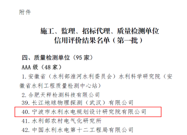 今年,寧波市水利院繼信息化業務企業信用獲評AAA最高等級后,再創佳績,勘察、設計、咨詢、質量檢測4項業務獲評AAA級,水資源論證,水文、水資源調查評價,水土保持方案編制3項獲評AAA+級,均為最高等級。其中,水文、水資源調查評價,質量檢測兩項為首次參評。