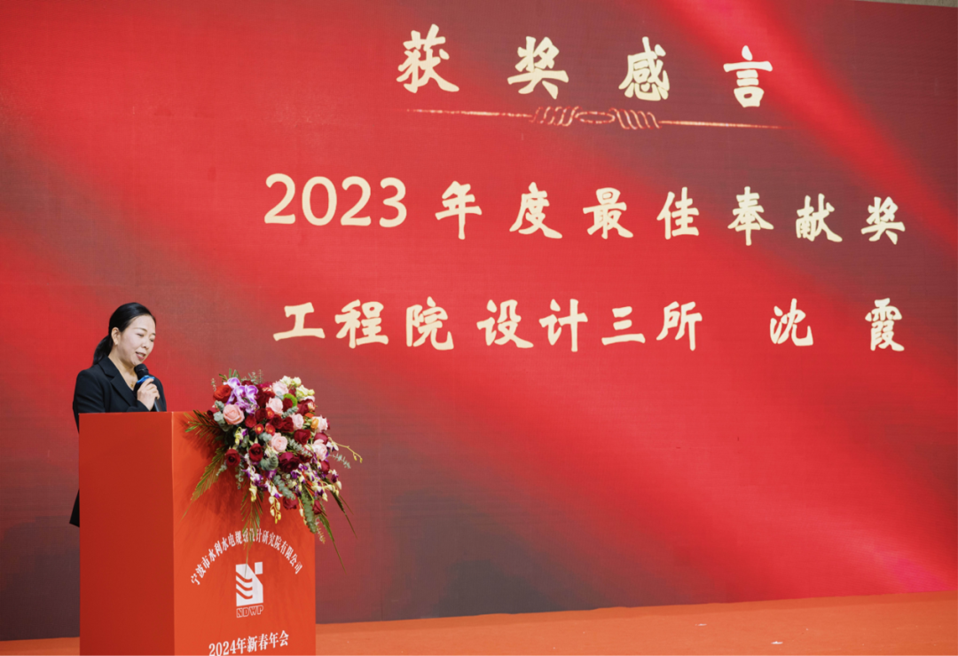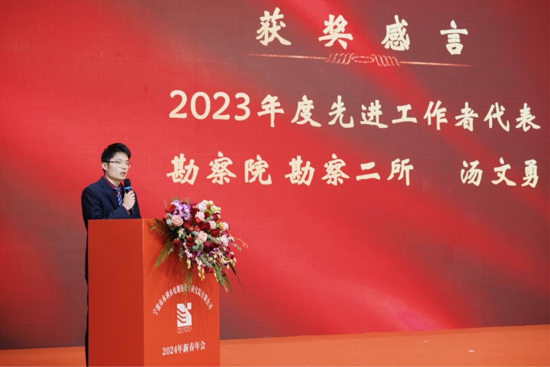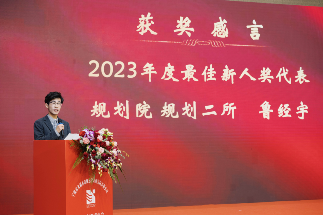 2023年度先進工作者獲獎代表勘察院勘察二所的湯文勇、2023年度最佳奉獻獎獲獎者工程院設計三所的沈霞、2023年度最佳新人獎獲獎代表規劃院規劃二所的魯經宇,先后上臺發表獲獎感言,以真摯的情感、質樸的語言和滿滿的憧憬,表達了自己與企業共同成長過程中的勵志故事和切身感悟,表達了寧波院中堅力量、團隊骨干和新兵后輩的豪情壯志。